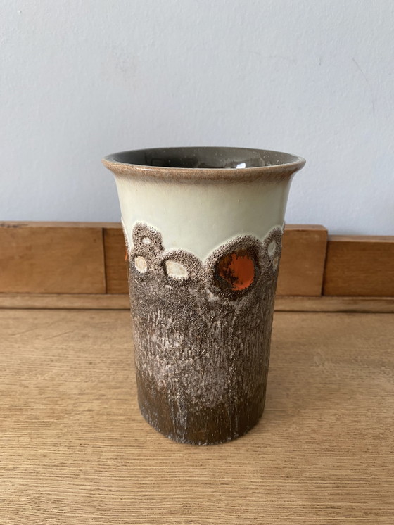 This 1960s Strehla Keramik vase is a beautiful example of the fatlava glazing technique. The vase has a unique texture and a combination of brown, orange and cream colors that give it a warm look. It is a decorative piece that fits perfectly into a vintage or retro interior. The vase is in excellent condition and a real eye-catcher for any room.