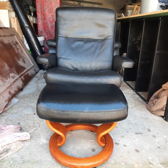Stressless recliner in black leather In very good condition with footstool