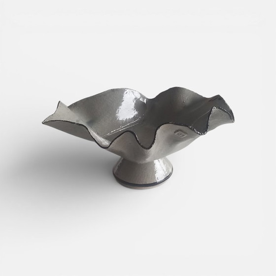 Decorative studio ceramic bowl on a foot with an expressive, organic design and a wavy rim. The piece is hand-formed and features a gray, lightly speckled glaze with darker rim accents.
