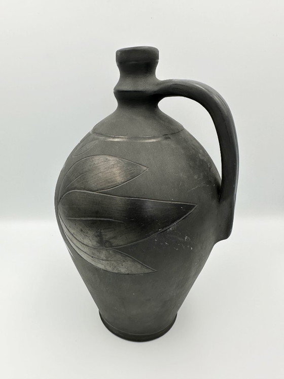 Black studio ceramic vase from West Germany with a slightly glossy floral design. Marked 200MR, maker unknown.