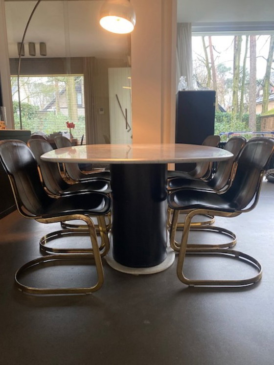 A magnificent Italian marble dining table that serves as the centerpiece of the set.