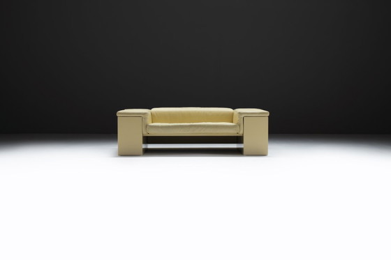 This particular example is executed in an extremely rare soft yellow cream leather upholstery, beautifully preserved and paired with a matching lacquered wooden base. Despite its geometric austerity, the sofa radiates comfort with its generously padded cushions and high supportive backrest. The contrast between the strict architectural form and the soft leather creates a balanced harmony that exemplifies Boeri’s design philosophy.