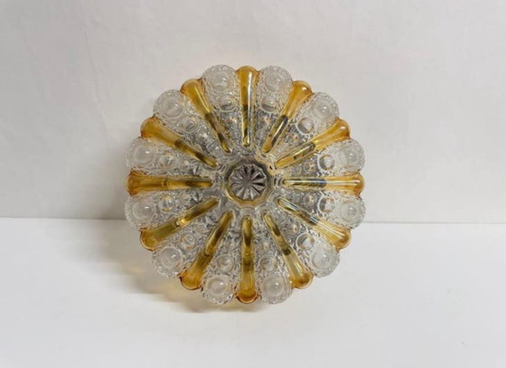 Beautifully crafted lamp of gold-colored glass with a gold-colored ceiling plate. The lamp has a diameter of 25 cm and a height of 11 cm.