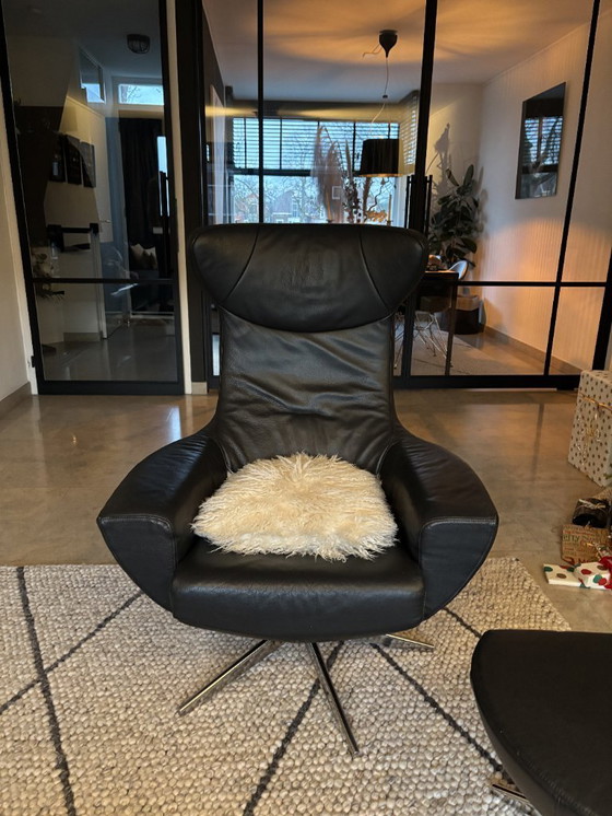 Beautiful Egg chair with matching footstool, finished in black leather. Timeless design that instantly adds ambiance to your interior. It's incredibly comfortable and both a real eye-catcher and a comfortable piece of relaxation furniture.