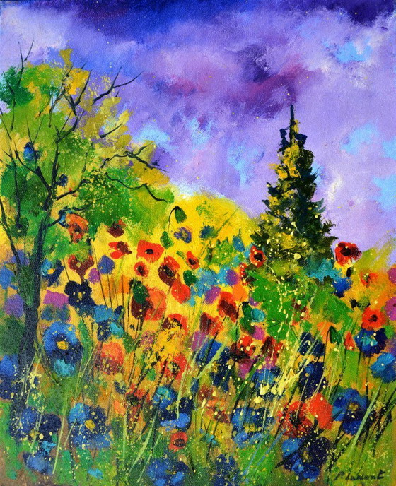 - Painted on canvas, this impressionistic masterpiece uses shades of blue, green, yellow, red, and purple to create a lush floral landscape.