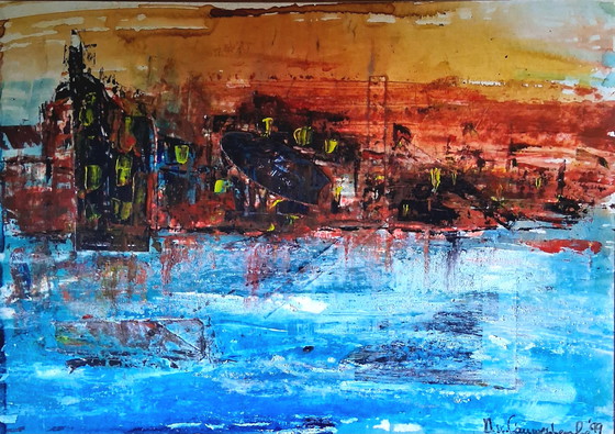 This painting, titled "Sunset in the Harbor," is a beautiful abstract artwork that captures the vibrant colors of a sunset in the harbor. The combination of blue, orange and yellow hues creates a dynamic and atmospheric composition. The artwork is made on acid-free cardboard and pasted on thin MDF. It exudes a modern and expressive style. Perfect for abstract art lovers who want to add a touch of color and energy to their space.