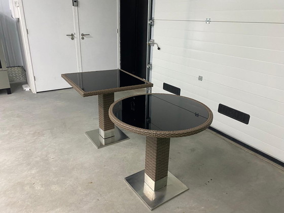 For sale: a batch of high-quality rattan garden/patio tables consisting of 9 square and 3 round tables. The tables are in good condition and ideal for a patio or garden. They are sturdy and weather-resistant.