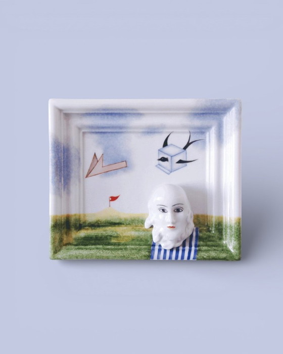 A rectangular porcelain sculpture or plaque with a strong surrealist feel. It combines painted elements with the 3D face of a wise man in a striped shirt against a hand-painted background full of symbolism.