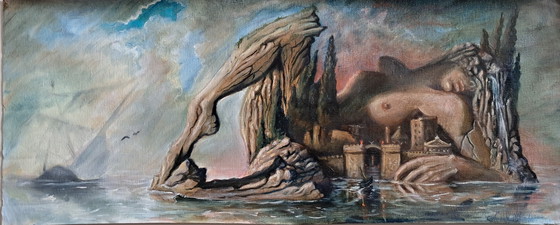 This is a captivating surrealistic landscape painting, featuring a dreamlike scene with imaginative elements. The artwork is rendered on canvas, showcasing a blend of earthy browns, blues, greens, and greys. The surreal style invites viewers to explore its intricate details and imaginative composition, making it a unique addition to any art collection.