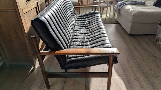 This sofa is in authentic vintage condition and has not been restored. The wooden frame of solid teak is sturdy and stable, with obvious signs of use such as light scratches and discoloration on the armrests, appropriate to the age of the furniture.