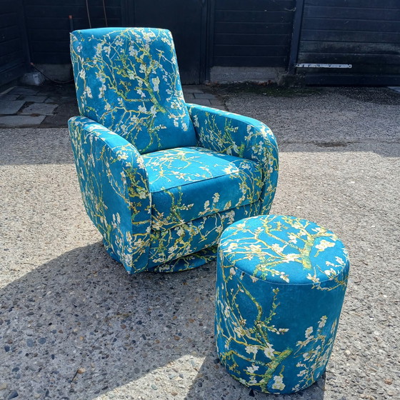 This swivel armchair, upholstered in Italian Van Gogh blossom fabric, comes with footstool and a free decorative pillow with purchase.