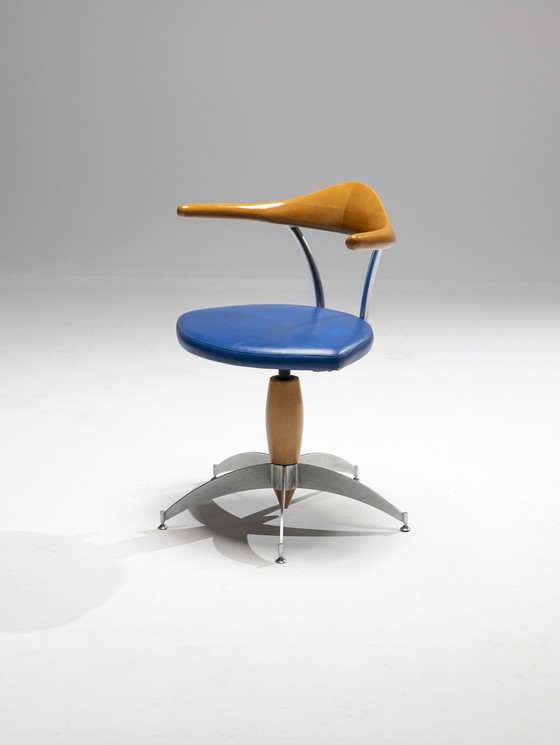 Is it a spider, a barber chair, a Hans Wegner swivel chair, a Bořek Šípek something? Considering its oddity and boldness, we believe it to be the last. Whatever it is, we love it, from the sculptural backrest down to the rocket-shaped base. Not to mention the fact that it swivels. Made from solid wood, blue leather, chromed and brushed steel, this comfy conversation piece is sure to draw endless attention and controversy.
