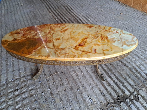 This exquisite mid-19th century marble coffee table is a testament to timeless elegance and refined craftsmanship. Its luxurious marble top, with its rich, swirling patterns of gold and brown, captures the eye and adds a touch of opulence to any setting. The intricate brass base, adorned with ornate detailing, complements the marble perfectly, creating a harmonious blend of materials that speaks to the grandeur of the era.