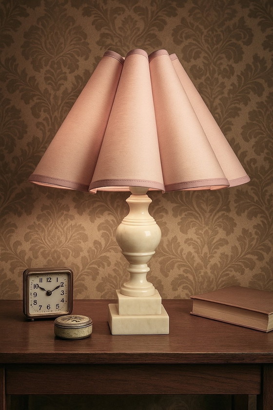 This is a vintage table lamp with an unusual shade. The lamp has a marble or alabaster base with a classic shape, which is common in lamps from the 1950s-70s. The shade consists of several separate cone-shaped parts in a soft pink shade, giving a unique and playful design. This type of lamp is decorative and fits well in a retro, classic or eclectic interior style.