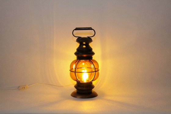Vintage table lamp from the 1980s with an elegant glass shade, encased in a sturdy metal frame. The design combines clean lines with a timeless retro charm. The lamp is in very good, well-maintained condition.