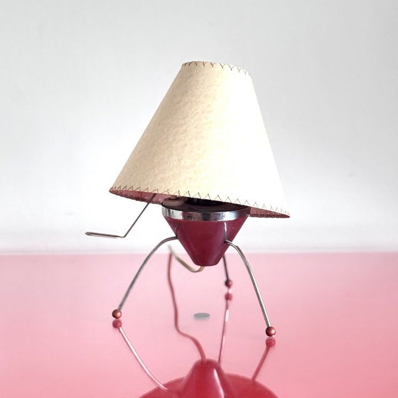 - Crafted with a striking red metal base and a cream textile shade, this lamp exudes vintage charm.