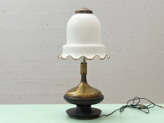 A striking Italian table lamp from the 1920s, featuring a handcrafted Murano glass shade with a characteristic, softly undulating silhouette. The heavy base, made of metal and lacquered wood, lends the lamp a sophisticated appearance, while the glass shade with its contrasting colored rim combines classic elegance with decorative appeal. The lamp emits a warm, atmospheric light and is ideal as accent lighting in a living room or bedroom.