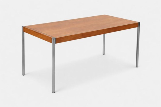 Rectangular walnut veneer top with a straight edge, highlighted by a chromed steel frame. Base composed of four square-section chromed steel legs, equipped with leveling feet. Assembled with exposed metal elements at the corners.