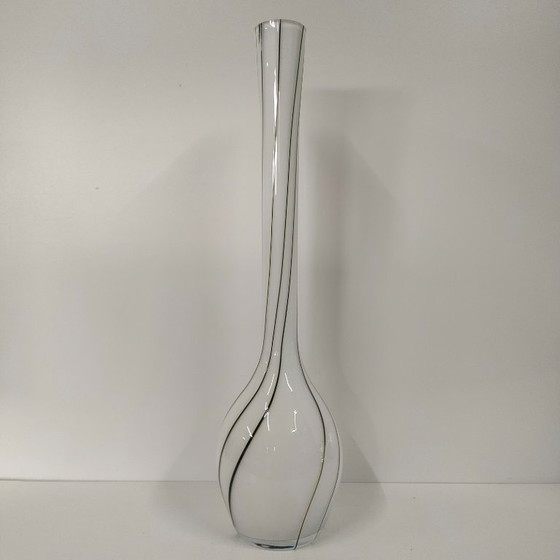Beautiful tall vase, Hand-blown origin (yet) undetermined, in the style of Wrzesniak Poland. Tall, narrow vase with lines that appear to lie on the glass. No chips or cracks. Excellent condition. Dimensions: Height 60 cm, Bulb diameter 15 cm, Neck diameter 4.5 cm, Base diameter 9 cm. The dimensions refer to the item itself. Please allow for 7-10 cm of extra packaging material during shipping. We always ship with insurance, potential disassembly, and packaging. Our approach is based on prioritizing quality, reliability, and safety for both parties, should anything unexpected occur during the shipping process. If your destination country is not listed, please contact us via message.