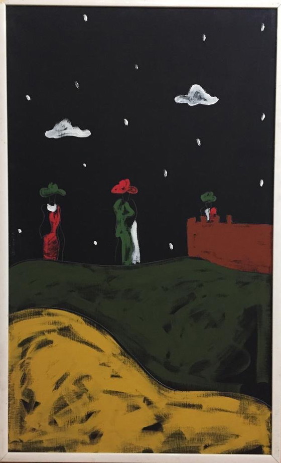 Immerse yourself in the fascinating world of Tano Festa with "Donna su Campo," a unique work from 1980. This oil on canvas painting captures the essence of a nocturnal landscape with stylized figures emerging from a vibrant field. Masterfully executed in oil on canvas, this piece is a true example of modern Italian art. The deep hues of black, green, and red create a striking contrast, while yellow adds a touch of warmth. The work is accompanied by an authentic Tano Festa archival certificate, guaranteeing its uniqueness and value. Add a touch of elegance and history to your collection with this masterpiece by Tano Festa.