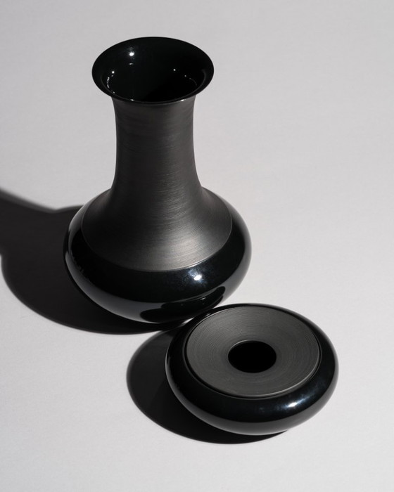 When assembled, the piece becomes a monolithic, almost enigmatic object—its presence more sculptural than functional. Light glides across the dome-like body while the matte disc remains cool and silent, creating a tension typical of Wirkkala’s works across glass, metal, and porcelain.