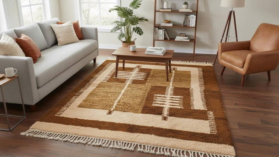 Immerse yourself in the rich cultural heritage of Morocco with this exquisite traditional Moroccan wool rug. Measuring a generous 300cm by 200cm, this piece is a testament to the timeless artistry and craftsmanship that defines Moroccan design. Its warm brown and beige tones create a harmonious palette that will effortlessly complement a variety of interior styles.