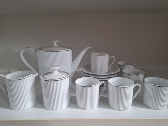Discover the timeless elegance of this Royal Porcelain by TG Ceramics tea set. This refined tableware, with its subtle silver trim and ribbed design, adds a touch of class to any tea table. Perfect for both formal and informal occasions, this set embodies craftsmanship and style. Includes a teapot, six cups and saucers, a milk jug, and a sugar bowl. Crafted from high-quality porcelain with a refined silver finish. (One cup has a small chip.) The ribbed design offers a classic look that never goes out of style. Add this beautiful piece to your collection and enjoy the refinement it brings to your home.