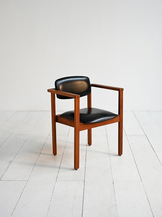 Danish chair from the 1960s, expressing a clean and well-balanced modernist design. The teak frame, defined by visible joinery and clear proportions, reflects the craftsmanship typical of Scandinavian production of the period. The rigorous lines and balance between solids and voids recall the design language of figures such as Børge Mogensen and Erik Buch, as well as the production of Danish manufacturers like Korup and Vamo. The upholstered seat and backrest, covered in black leather, create an elegant material contrast with the warmth of the wood.