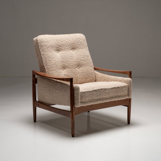 This armchair from the 1960s is a true showpiece. Designed to focus on simplicity and functionality, it features clean lines and a minimalist aesthetic. Made from high-quality materials, such as teak wood and fabric (mainly a blend of wool and cotton), it exudes a timeless elegance that fits seamlessly into any modern home. The fabric is slower-woven and showcases thicker wool yarns that intentionally give this volume an unstructured look. Furniture designer Ib Kofod-Larsen was born in Denmark in 1921 and studied at the Danish Royal Academy in Copenhagen. He trained as an architect and was particularly inspired by Danish furniture design, characterized by elegant, organic, sculptural forms. Beautiful woods, such as teak and rosewood, as well as rich leathers, are what he worked most often with.