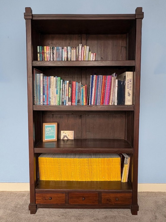 These beautiful teak bookcases are an asset to any room. With their rich, dark wood color and sturdy construction, they offer not only a stylish storage solution but also a timeless look that fits into various interior styles. The cabinets feature multiple shelves and three convenient drawers at the bottom, ideal for storing books, magazines, and other decorative items. The open slatted sides create an airy appearance and make the cabinets suitable for both modern and classic interiors. Add a touch of elegance to your living room, office, or study with these versatile bookcases.