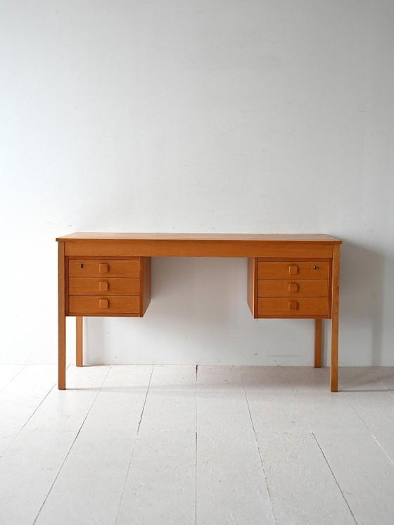 Essential and functional design for this 1960s Danish desk in light teak. The two floating drawer units feature six drawers with distinctive sculpted handles in a geometric shape. The clean silhouette and airy proportions reflect the Nordic modernist aesthetic.
