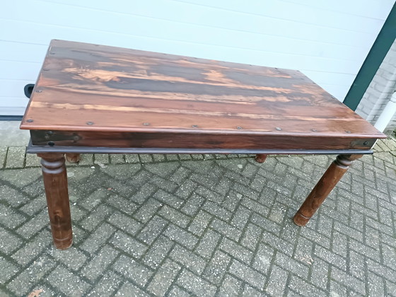 Antique Indian teak dining table with plenty of character. The wood is unique, with metal hardware and round legs.
