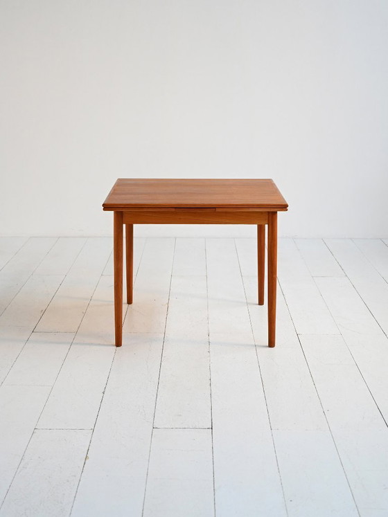 Extendable dining table of Scandinavian production from the 1960s, crafted in warm and even-toned teak veneer. The top features pull-out extension leaves, a discreet and functional solution that allows the table to expand while preserving its visual balance. The slender structure with tapered legs reflects the language of Scandinavian modernism, with affinities to designers such as Børge Mogensen and Arne Vodder, where proportion and constructive clarity are essential. “Made in Denmark” label present.