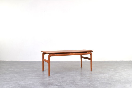 This mid-century style coffee table was designed by Peter Hvidt and Orla Mølgaard-Nielsen and manufactured by France & Søn in the 1950s. Crafted from solid teak, the table has been professionally and carefully restored by removing old coatings, staining and finishing with varnish. The restoration was carried out by a talented and experienced carpenter with over 20 years of experience. Thanks to these treatments, the desk looks stunning and will serve its new owner for many years without fear of damage or wear and tear from everyday use.