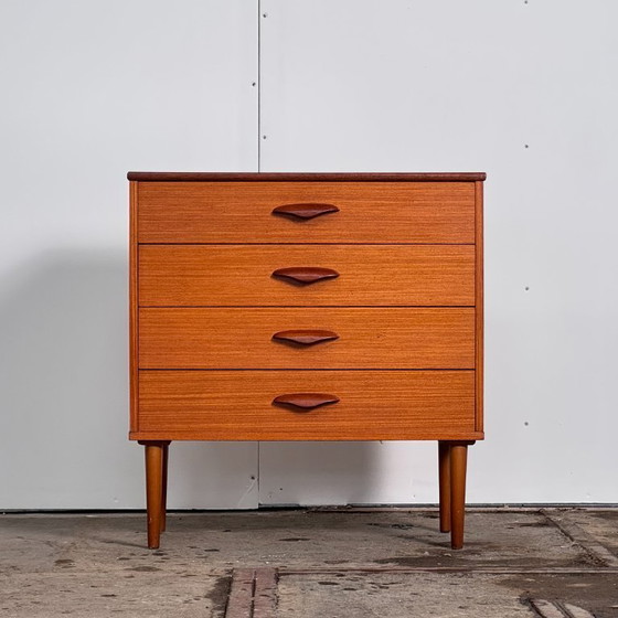 Compact teak sideboard from the 1960s with four drawers. Kept in original condition, showing minimal signs of use — all visible in the photos. Clean, functional piece with no hidden issues.