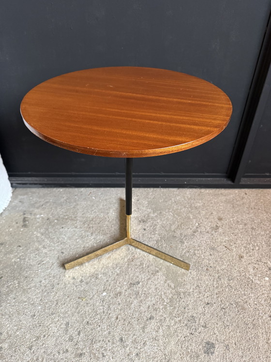 Elegant small round teak side table, also known as a "wine table," with a gold and black metal tripod base in a Scandinavian style from the 1960s; can be used as an end table, pedestal table, bedside table, etc. Good overall condition (some signs of age on the metal and two small dents in the wood: see photos).