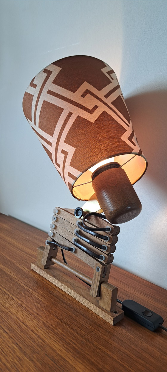The combination of solid wood (teak finish), the functional accordion/scissor mechanism, and the stylish geometric fabric shade makes this lamp a true interior highlight.