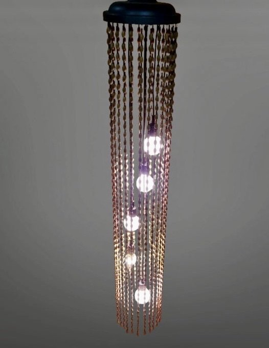 Temde hanging lamp model 887 with 5 lamps that cascade down between almost 2 meter long strands. Strung with natural-colored wooden beads and dark-stained small wooden beads. The light bulbs and a replacement bulb are included. The lamp casts a great light and is in very good condition, only signs of wear due to age.