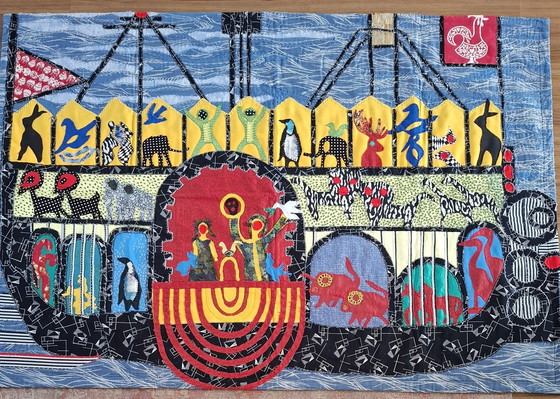 Bring a touch of nostalgia and color to your space with this beautiful vintage handmade textile artwork. Depicting Noah's Ark, this rug is a true eye-catcher that can shine both above the table and on the wall.