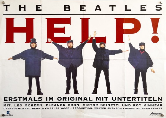 A crisp, high-impact composition, this German-market B2 distills Richard Lesterās pop-caper into monumental red HELP! letterforms set against a clean white field. The Beatles appear as a rhythmic frieze in dark winter coats, striking semaphore-like poses that read instantly at distance. āTHE BEATLESā crowns the layout with typographic authority; a lower band carries director and principal cast credits in the familiar continental style. The line āErstmals im Original mit Untertitelnā flags an English-language print with German subtitles, a telling cue for how the film circulated beyond the UK and US.