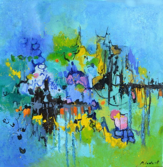 Discover "The City of Joy," a captivating abstract artwork that evokes a symphony of colors and emotions. This painting, created on canvas, features a vibrant palette of blues, greens, yellows, and touches of pink and orange, creating a dynamic and joyful atmosphere.