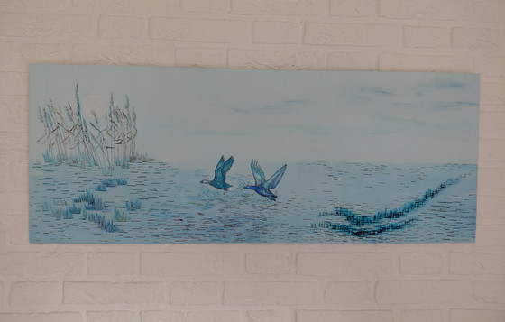 Let yourself be carried away by the serene beauty of "Life at the Riverside". This beautiful painting on wood captures the peace and harmony of birds in flight over a calm waterscape. The subtle blue tones and minimalist style make it a perfect addition to any room that could use a touch of tranquility and elegance. Crafted with burnt lines and sculpted structures on a wooden panel with a protective coating, ensuring the colors remain vibrant and durable. The minimalist style creates a timeless look that fits effortlessly into any interior. Ideal for nature and art lovers looking for a unique piece to adorn their home. Add this artwork to your collection and let it enrich the atmosphere of your home.