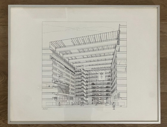 Two screen prints of the designs for the 1986 architectural competition for the new building of The Hague City Hall.