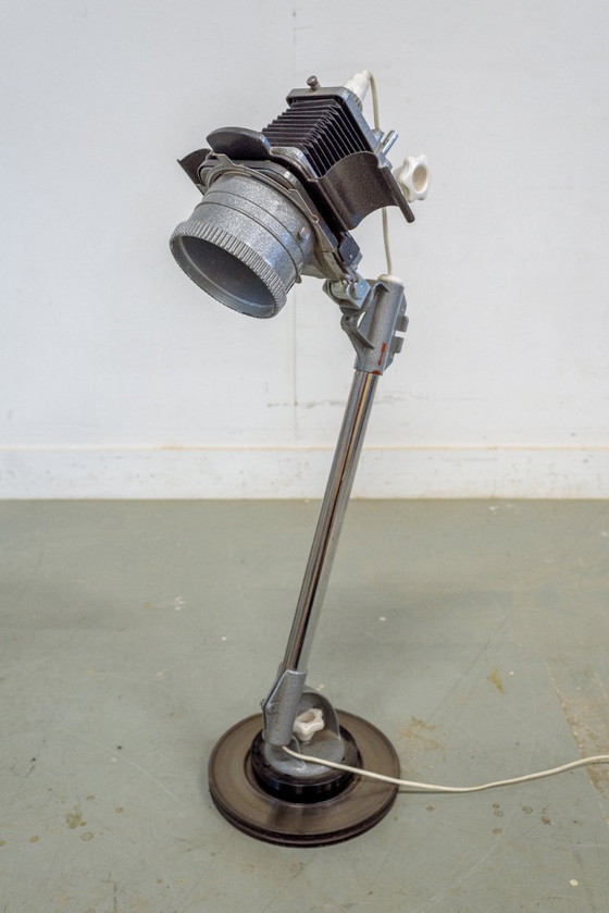 This handmade floor lamp is a unique 'one-of-a-kind' object for the technology enthusiast with a story. Built around an original Meopta Opemus enlarger head, this is a high-quality example of upcycling where the history of the darkroom remains tangible.