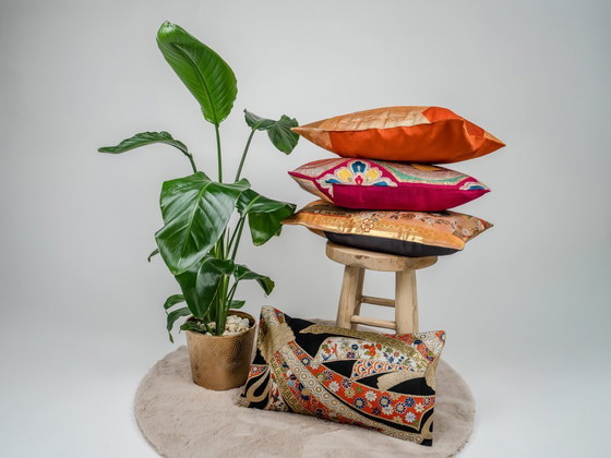 The vibrant palette of vermilion, azure, and white against the heavy, gold-textured knot creates a stunning visual pop against the midnight black silk ground. Hand-tailored from an authentic vintage Japanese Obi, this 30x50cm art piece is finished with a seamless envelope closure, preserving the intricate flow of the ribbons. As a piece of sustainable luxury, it stands as a high-end interior accent that brings a spirit of celebration and connection to any room.