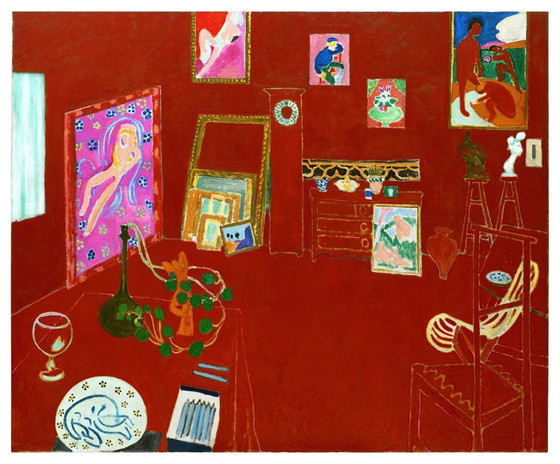 Derek Jarman describes Matisse's painting: "The walls of Matisse's studio were gray, but he ignored this and celebrated the new century with great fanfare, imagining red walls in his 1911 Red Studio. In this painting, the room and all the furniture are dissolved into scarlet—as if saturated."