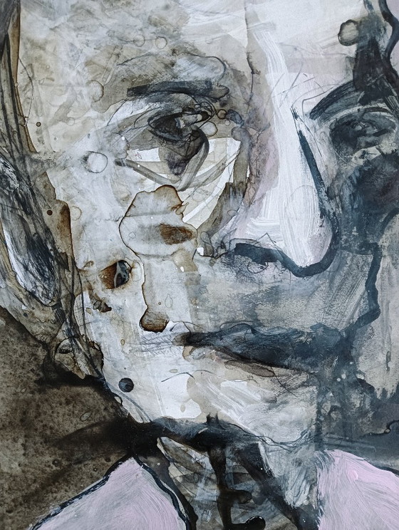 - The artwork is executed in an expressive style, utilizing earth tones and subtle pink accents that enhance the emotion of the portrait.