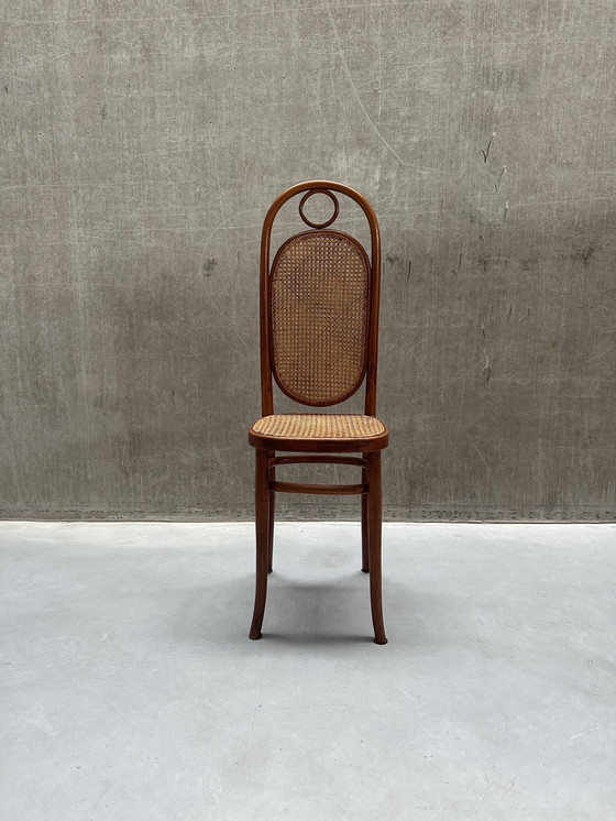 Beautiful (decorative) chair based on the Thonet shop chair - Lange Jan model. Dimensions: 113 cm high, 33.5 cm wide, 41 cm deep Seat height 54 cm.