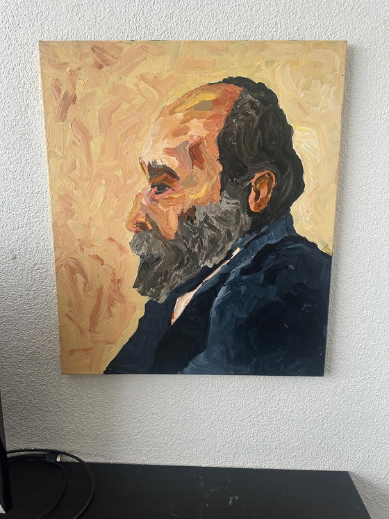 This beautiful, framed painting, titled "Thoughtful Thinking" or "Wise Thoughts," by E. van Bekkum, is a striking example of Impressionist art. The work depicts a thoughtful man in profile, captured in rich, earthy tones that evoke a sense of depth and emotion. With deft brushstrokes, the artist has created a vibrant portrait that both intrigues and inspires.