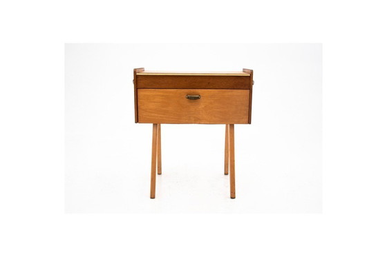 A small, minimalist table with drawers and compartments. Originally used as a sewing table, it even has a stand for spools of thread, today it can be used for its original purpose or for storing small items and as a small coffee table.